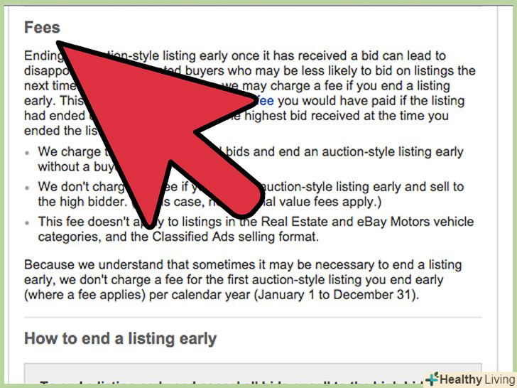 Врахуйте, що вам, можливо, доведеться заплатити штраф.якщо залишилося більше 12 годин і на товар зроблені ставки, вам доведеться заплатити штраф, щоб видалити оголошення раніше терміну і, тим самим, скасувати ці ставки.- Зауважте, що це не відноситься до товарів в категоріях «Real Estate» і «eBay Motor vehicle». Також штраф платити не потрібно, якщо оголошення розміщено на eBay Classifieds.