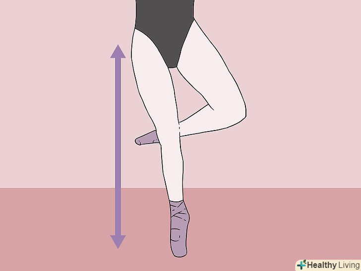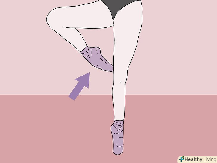 Випряміть ногу обертання.напружте верхню частину стегна, щиколотку і коліно ноги обертання, щоб створити жорсткий стрижень, на якому можна обертатися. Встаньте навшпиньки ногою обертання, зберігаючи пальці ноги обертання розслабленими і швидко реагують для точного налаштування свого балансу під час обертання.- Ваша точка обертання-це» куля " вашої ноги обертання, який знаходиться безпосередньо позаду ваших пальців ніг. Не обертайтеся безпосередньо на пальцях ніг. Це неможливо і неймовірно болісно, незалежно від того наскільки переконливо виглядають з боку хороші балетні танцівники.