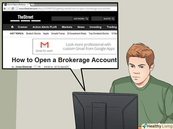 Відкрийте брокерський рахунок.незалежно від обраного варіанту вашим наступним кроком буде відкриття брокерського рахунку. Ви також можете розглянути варіант відкриття індивідуального інвестиційного рахунку (ІВС).[37] у більшості брокерів рахунок можна відкрити онлайн або навіть через Мобільний додаток. При цьому вам може знадобитися надати певні документи або заповнити деякі форми. Список документів та інші нюанси можуть варіюватися.- Якщо ви плануєте скористатися довірчим управлінням, вибирайте того брокера, який здається вам надійним і з яким ви будете готові поділитися своєю особистою фінансовою інформацією. Чим більше інформації буде у керуючого активами, тим успішніше він зможе вирішувати поставлені перед ним завдання відповідно до ваших потреб.