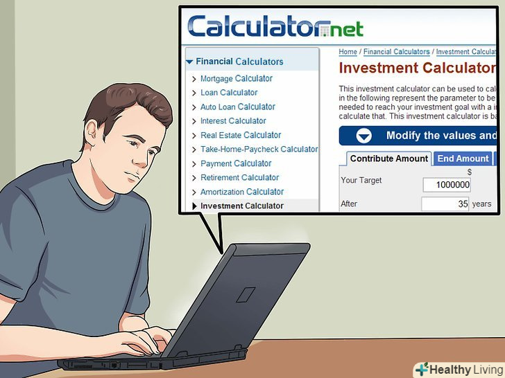 Обчисліть, які інвестиції потрібні для досягнення цілей.для обчислення ви можете використовувати будь-який з безлічі доступних в Інтернеті калькуляторів.[5] обчисліть відсоток, який ви плануєте отримувати за своїми інвестиціями, і розмір цих інвестицій для досягнення ваших цілей.- Наприклад, припустимо, вам потрібно накопичити 300 000 рублів за три роки, але ви можете інвестувати тільки 5000 рублів на місяць. В такому випадку вам потрібно знайти спосіб отримувати колосальні 38,2% річних всі три роки для досягнення цілей, а це пов'язано з високими ризиками. Більшість інвесторів вважатимуть такі інвестиції поганим рішенням.