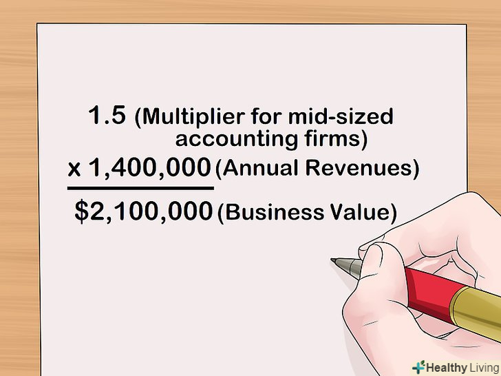 Розрахуйте вартість, використовуючи для цього коефіцієнт.коли ви знайдете необхідні фінансові показники і відповідний коефіцієнт, просто помножте одне значення на інше, і отримаєте приблизну вартість компанії. Повторимося, що це дуже груба оцінка ринкової вартості компанії.- Припустимо, що множник для середніх бухгалтерських фірм буде розраховуватися за такою формулою: 1,5 помножити на суму річного прибутку. Якщо загальна сума доходів Андерсон Ентерпрайз за цей рік становить 1400000 доларів, тоді згідно з методом множника, його ринкова вартість буде дорівнює 1,5*1400000 або 2100000 доларів.