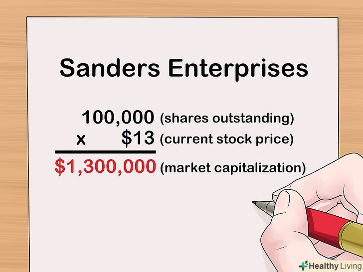 Щоб визначити ринкову капіталізацію, ви повинні помножити кількість розміщених акцій на поточну їх вартість.отримана цифра буде дорівнює загальній вартості всіх часток акціонерів, що досить точно відображає загальну вартість компанії.- Наприклад, ми розрахуємо ринкову капіталізацію Сандер Ентерпрайз, вигаданої публічної телекомунікаційної компанії, чия кількість розміщених акцій дорівнює 100000. Якщо поточна ціна кожної акції дорівнює 13 доларам, тоді розрахунок ринкової капіталізації буде наступним:100000 * 13 = 1300000 доларів.