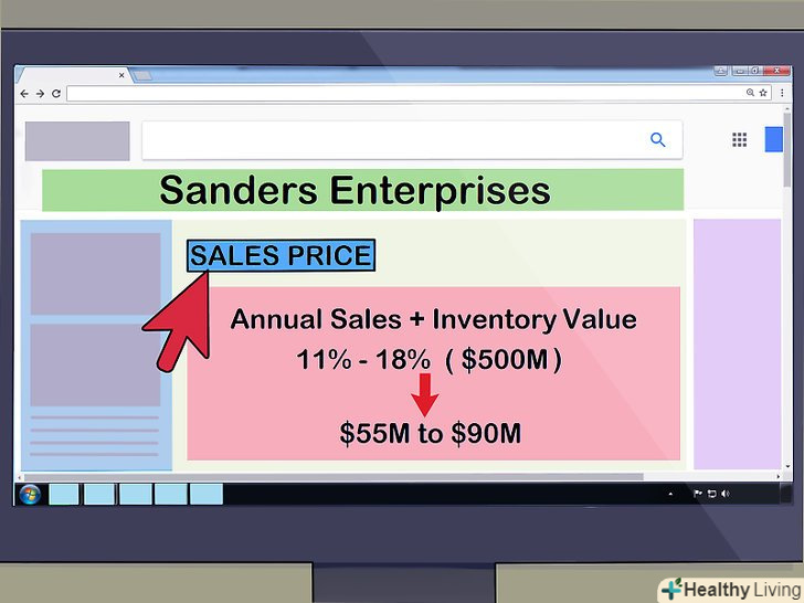 Визначте, чи підходить для цього даний метод.даний метод оцінки ринкової вартості компанії підходить в тому випадку, якщо компанія знаходиться в приватній власності або значення ринкової капіталізації з тієї чи іншої причини здається не мають нічого спільного з об'єктивною реальністю. Щоб оцінити ринкову вартість, порівняйте вартість продажів порівнянних компаній.[5]- Оцінка ринкової капіталізації може бути не реалістичною, якщо капітал компанії в основному знаходиться в нематеріальних активах, а самовпевненість і спекуляції інвесторів призводять до надмірного завищення вартості акцій.[6]