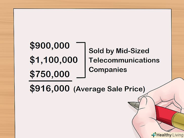 Виведіть середнє значення суми продажів. коли ви знайдете недавні продажі порівнянних компаній або оцініть продажі подібних публічних компаній, виведіть середнє значення з суми всіх продажів. Це середнє значення може бути використано на початку оцінки ринкової вартості обраної вами компанії.- Наприклад, уявімо, що нещодавно були продані 3 середні телекомунікаційні компанії вартістю в 900000, 1100000 і 750000 доларів. Середнє значення сум продажів дорівнює 916000. Таким чином, ринкова капіталізація Андерсон Ентерпрайз вартістю в 1300000-це більш ніж оптимістичний погляд на вартість фірми.
