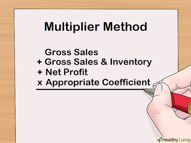 Знайдіть відповідний коефіцієнт.коефіцієнт залежить від галузі, умов ринку та особливих занепокоєнь всередині фірми. Це число за своєю природою є довільним, але ви можете використовувати показник, отриманий від торгово-промислової асоціації або експерта з оцінки вартості бізнесу.[10]- Джерело, у якого ви дізналися коефіцієнт також може вказати, які фінансові показники необхідно використовувати при розрахунках. Зазвичай починають з суми річного обсягу продажів (чистого прибутку).