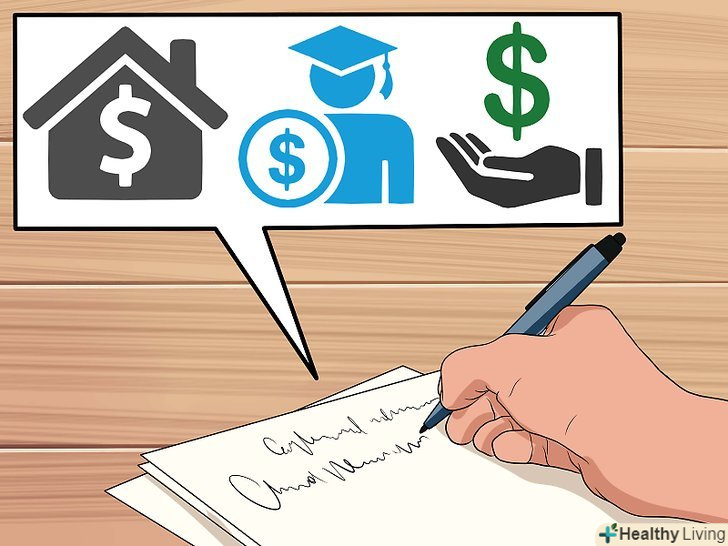 Складіть список того, чого ви хочете.щоб поставити перед собою цілі, потрібно розуміти, чого ви хочете досягти за допомогою грошей. Наприклад, як ви хочете жити на пенсії? Чи Любите ви подорожі, красиві машини, смачну їжу? Чи скромні ваші потреби? Цей список допоможе вам сформулювати цілі на наступному етапі.[1]- Список також буде корисний, якщо ви відкладаєте гроші для дітей. Наприклад, чи хочете ви відправити дітей в престижні школи або університети? Чи хочете ви купити їм машини? Вас влаштовують звичайні школи? Ви готові витратити зайві гроші на щось інше? Чітке розуміння того, що для вас важливо, дозволить вам поставити перед собою фінансові цілі і зрозуміти, як вам потрібно відкладати гроші і як інвестувати їх.