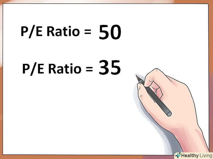 Порівнюйте значення P / E з іншими компаніями тієї ж галузі. сам по собі P/E марний, його значення не скаже вам нічого, якщо не порівняти його зі значеннями P / E У інших компаній тієї ж галузі. Акції компаній з більш низьким P / E дешевше для покупки, проте, такий аналіз не дозволить прийняти саме рішення про покупку.- Наприклад, акції компанії ABC торгуються за ціною 15 доларів за акцію, а P/E становить 50. Акції компанії XYZ торгуються за ціною 85 доларів за акцію, а P/E дорівнює 35. Дешевше буде купити акції XYZ, навіть незважаючи на те, що ціна у них вище, ніж у акцій компанії ABC. Це пояснюється тим, що у випадку з акціями XYZ доведеться заплатити 35 доларів за кожен Долар доходу, а у випадку з акціями ABC доведеться заплатити 50 доларів за кожен Долар доходу.