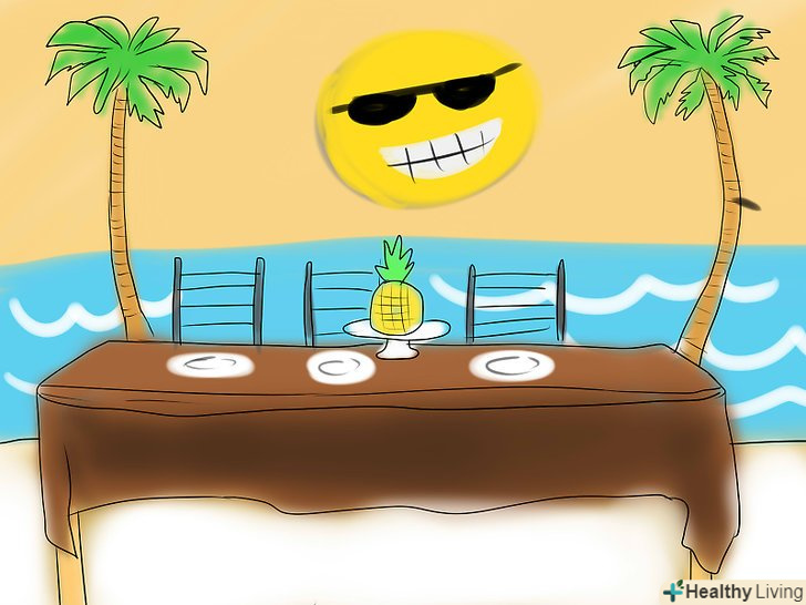 Розташуйтеся на відкритому повітрі (якщо дозволяє погода).можна зробити декоративну пальму і вирізати кілька шматків картону так, щоб вийшов океан. Накрийте для всіх великий стіл з частуваннями.