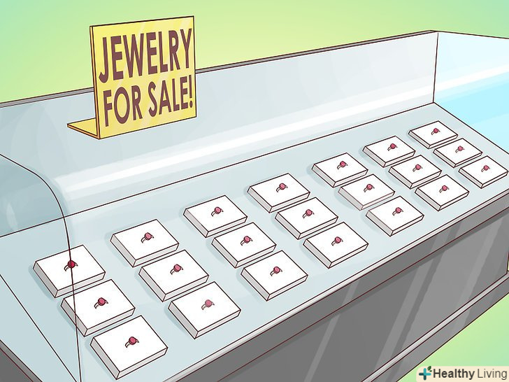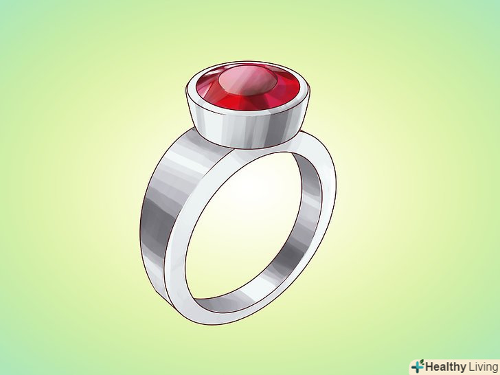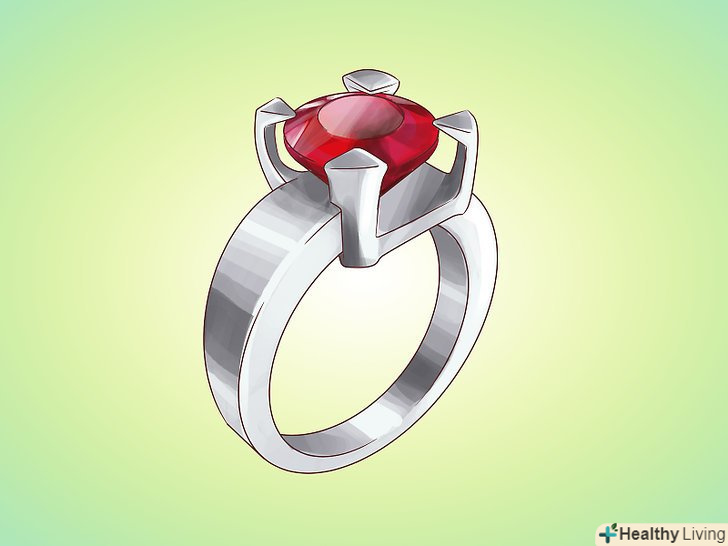 Виберіть метал, виходячи з уподобань і бюджету.зазвичай рубіни поміщають в біле золото. Однак вибір металу залежить від ваших особистих переваг. Якщо ви купуєте рубін комусь в подарунок, спробуйте з'ясувати, з якого металу зроблені прикраси цієї людини.[17] Lower carat precious metals are cheaper, but may be less lustrous or more capable of tarnishing.