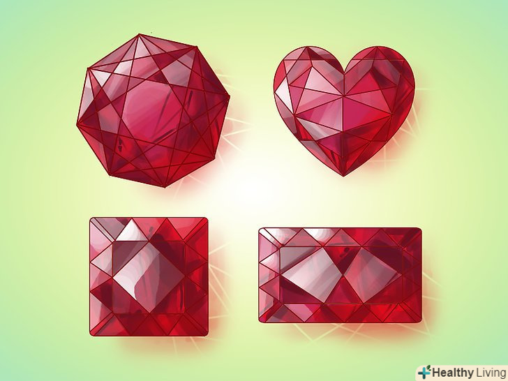 Вибір огранювання.по огранювання дорогоцінного каменю можна визначити, як він був зроблений ювеліром. Загальна огранювання краще, в той же час багато рубіни огранюють в овальній формі, у формі «валика» (округлений квадрат) або кола. Інші досить поширені форми огранювання - » серце «і» подушечка " (прямокутник з відрізаними куточками). Але через низький попит вони можуть бути трохи дешевше в порівнянні з дорогоцінними каменями аналогічної якості, обрамленими в іншу огранювання.[6][7]