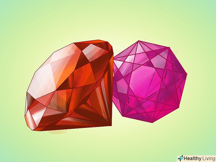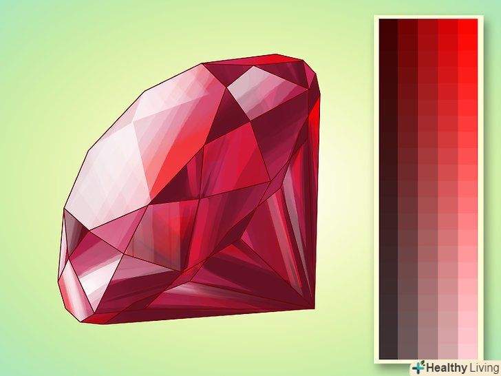 Виберіть колір.Каталоги або вебсайти з рубінами можуть приводити їх відповідно до кольору або відтінку. Незважаючи на те, що чисто червоні і пурпурні рубіни найбільш дорогі варіанти, рубіни високої якості можуть бути також і оранжево-червоними, рум'яними або рожевими. Вибір кольору-це справа смаку.[8]- Якщо вам цікаві рожеві рубіни, зверніть увагу також на рожеві сапфіри. Сапфіри і рубіни роблять з однакових мінералів, корундів, і їх спільно класифікують за кольором. Рожеві дорогоцінні камені можуть класифікуватися за цією ж ознакою.