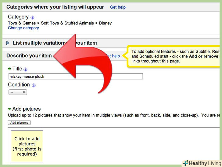 Продовжуйте описувати свій товар.Увімкніть фотографію, або ж до 12 фотографій за дещо вищу плату, а також розміри, колір і інформацію про доставку. Використовуйте стільки конкретики, наскільки це можливо.- Для того щоб отримати більше знімків в обліковому записі без плати, можете створити подвійну фотографію в Photoshop і завантажити одну фотографію з декількох кутів.