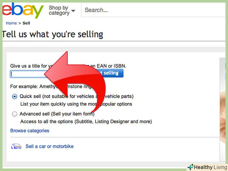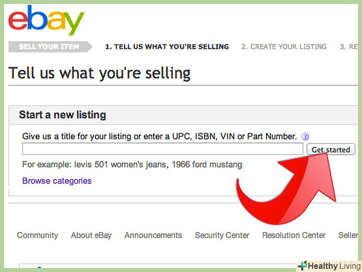 Введіть заголовок для свого товару у верхній частині сторінки "Sell".eBay пропонує включити колір, марку, матеріал і назву моделі. Натисніть розділ "Get Started".