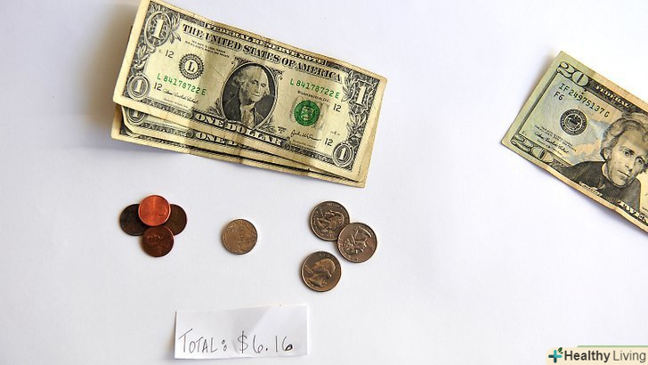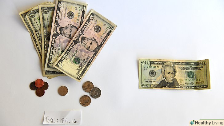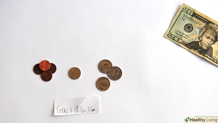 Починайте з пені, відрахуйте достатньо дрібниці (починаючи з відліку виходячи з ціни покупки), щоб перейти до наступної монеті або розміру рахунку.- Приклад: $5.22 з $10.00.