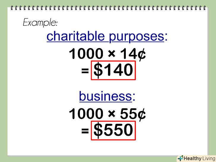 Помножте загальну кількість км, пройдених протягом року, на вартість.якщо ви розрахували, що дорога до благодійних організацій обійдеться вам в 10 рублів за км, а дорога до місця роботи – в 38 рублів за км, помножте кількість пройдених км на вартість. Відповідно, на 10 рублів і 38 рублів.