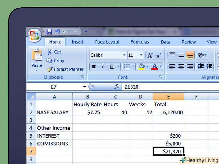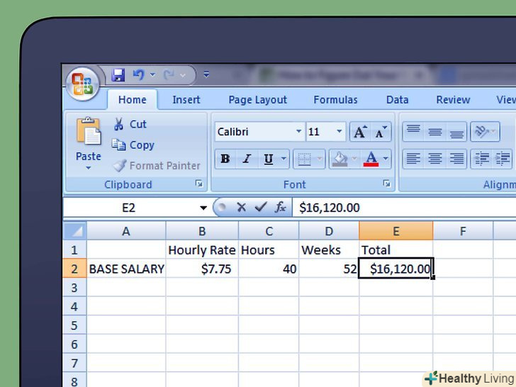 Введіть це число в електронну таблицю або просто запишіть на папері.це ваш базовий річний оклад, і в цьому прикладі він становитиме $16,120.00.- Для електронної таблиці помножте тижневу ставку на кількість відпрацьованих годин, потім на кількість відпрацьованих тижнів. Це дозволяє відредагувати числа, якщо обставини зміняться.