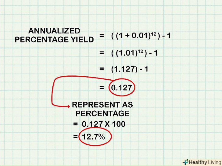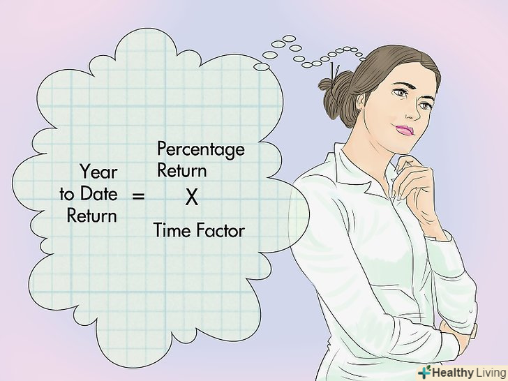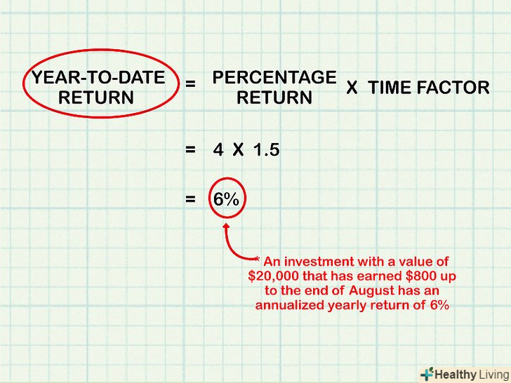 Визначте, коли використовувати цей метод.у деяких випадках, наприклад, у випадку інвестицій, прибутковість складно порахувати на щомісячній, щоквартальній або щотижневій основі. У цьому випадку прибутковість обчислюється з початку року до поточної дати в річному обчисленні. Цей метод не застосовується для обчислення простої або складної річної процентної ставки. Однак отримана прибутковість може свідчити про рентабельність інвестицій у річному обчисленні; більш того, цю прибутковість можна порівняти з прибутковістю за іншими інвестиціями.[9]