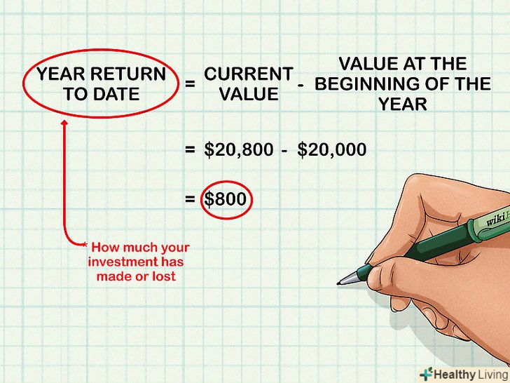 Знайдіть прибутковість з початку року до поточної дати.тобто з'ясуйте, скільки ви заробили (або втратили) на інвестиціях. Для цього відніміть вартість інвестицій на початку року з вартості інвестицій на поточний момент часу.- Наприклад, якщо на початку року вартість інвестицій дорівнювала 20000 рублів, а на поточну дату вартість інвестицій дорівнює 20800 рублів, то прибутковість з початку року до поточної дати дорівнює 800 рублів (20800 - 20000).[10]