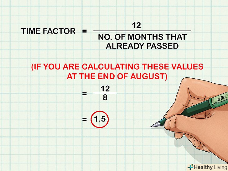 Обчисліть часовий коефіцієнт. Він описує час, що минув з початку року, і використовується при визначенні відсотка прибутковості в річному обчисленні. Щоб обчислити часовий коефіцієнт, розділіть кількість місяців, що минув з початку року, на 12.[12]- Наприклад, якщо розглядається кінець серпня, то з початку року пройшло 8 місяців.