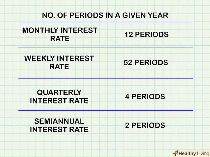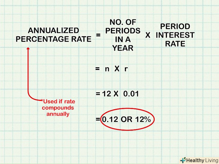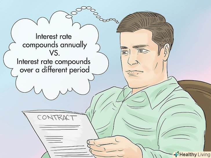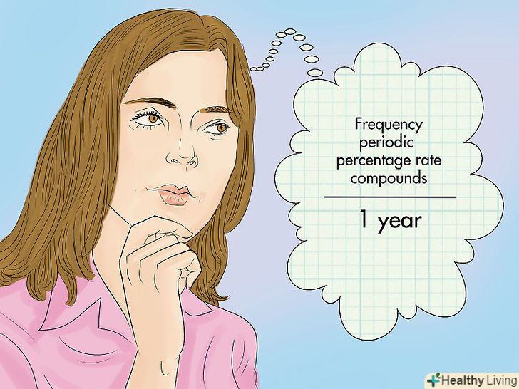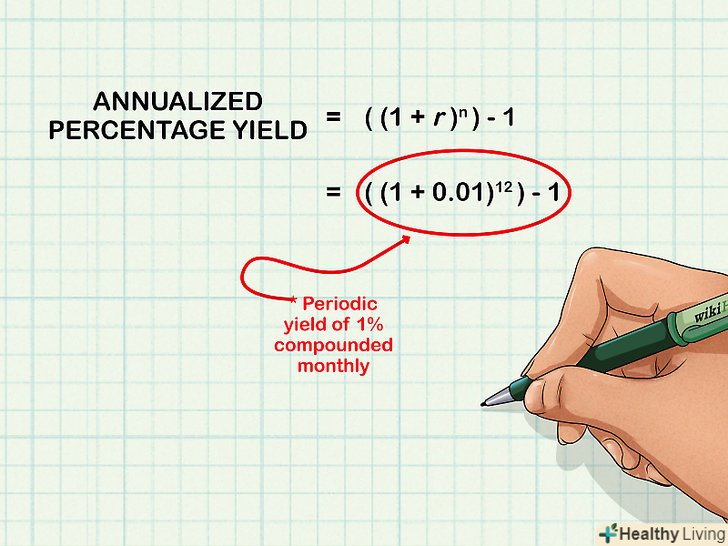 З'ясуйте, як нараховується заявлена процентна ставка протягом року.майте на увазі, що існує різниця, коли відсотки нараховуються раз на рік (тобто платежі здійснюються тільки один раз на рік) і коли відсотки нараховуються раз на місяць (або з іншою періодичністю). Якщо відсотки нараховуються на щорічній основі, використовуйте метод, описаний у попередньому розділі; в іншому випадку обчисліть складну річну процентну ставку.[4]