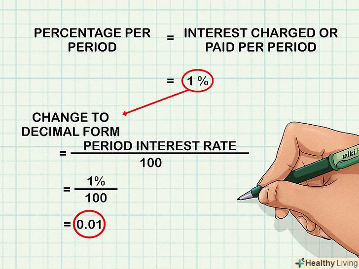 Визначте періодичну процентну ставку.це сума, що виплачується або отримується за певний період часу. Наприклад, якщо по кредиту виплачується 1% на місяць, періодична процентна ставка дорівнює 1%. Якщо протягом року періодична процентна ставка не змінюється, на її основі можна обчислити річну процентну ставку.- Щоб обчислити річну процентну ставку, потрібно знати періодичну процентну ставку, виражену у вигляді десяткового дробу. Для цього розділіть зазначену періодичну процентну ставку на 100.