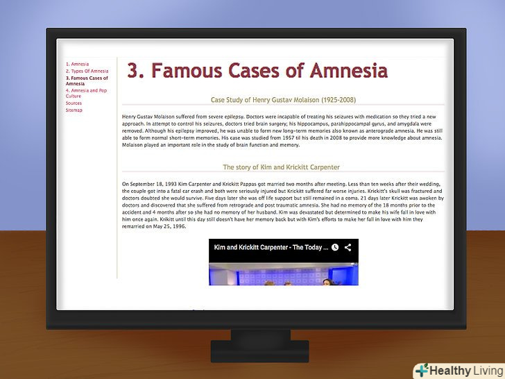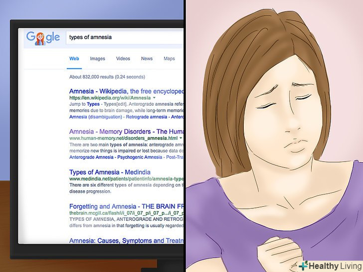 Вивчіть симптоми обраного типу амнезії.незважаючи на рідкісні випадки захворювання, амнезія досить добре досліджена. Існує безліч інформації про симптоми і причини, а значить, ви зможете добре підготуватися. Випадки амнезії підрозділяю на два основних типи[1]:- Антероградна амнезія - ви пам'ятаєте події з минулого, які відбулися до травми (зазвичай це фізичні пошкодження голови), але втратили здатність перетворювати короткочасну пам'ять в довготривалу. Нова інформація просто не затримується у вашому мозку.