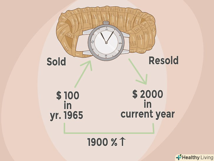 Розраховуйте приріст вартості на колекційні товари.колекційні товари, такі як старовинні автомобілі, годинники і картини з плином часу можуть зростати в ціні. Приріст їх вартості також може оцінюватися у відсотках за тією ж формулою. Вам буде потрібно лише зіставити стару і поточну вартість колекційного товару. Наприклад, якщо в 1965 році настільний годинник "Маяк" продавалися, наприклад, по 14 рублів, то тепер вони вже перепродаються за ціною від 1000 рублів і вище (в залежності від стану), що говорить про приріст вартості в розмірі 7043% (і це ще без урахування деномінації рубля в 1998 році).[10]