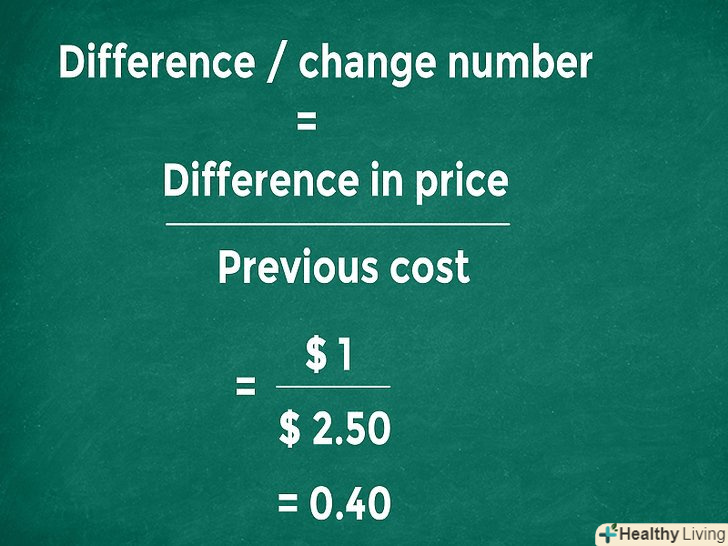 Відніміть колишнє значення вартості з поточного.почніть розрахунок з підстановки своїх даних у формулу. Потім спростіть зовнішній вигляд формули, розрахувавши різницю між поточною і колишньою вартістю товару в чисельнику.[5]- Наприклад, якщо раніше ви платили за пакет молока 55 рублів, а тепер він коштує 60 рублів, необхідно відняти з останньої ціни її колишнє значення, і у вас вийде різниця в розмірі 5 рублів.