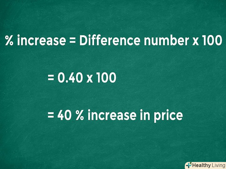Конвертуйте результат розрахунку в відсотки.помножте отримане значення на 100%, щоб дізнатися, на скільки змінилася вартість товару в процентному вираженні. Підсумковий результат буде говорити про те, скільки відсотків від старої ціни склало збільшення вартості товару до його поточної ціни. [7]- У наведеному прикладі розрахунок буде таким: