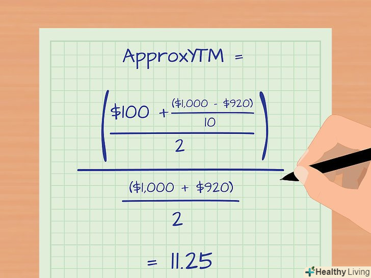 Знайдіть необхідні дані. щоб обчислити приблизне значення прибутковості до погашення, знайдіть значення купонного платежу, номінальну вартість облігації, сплачену ціну (за облігацію) і кількість років до погашення. Знайдені дані підставте в наступну формулу: Приблизна прибутковість до погашення =(C + ((F-P)/n))/(F+P)/2.[1]- C-купонний платіж, тобто процентні виплати по облігації, які здійснюються на користь її власника раз на рік.