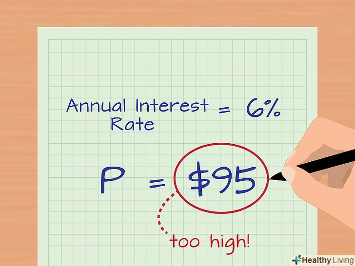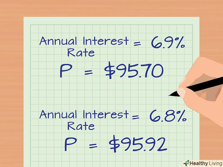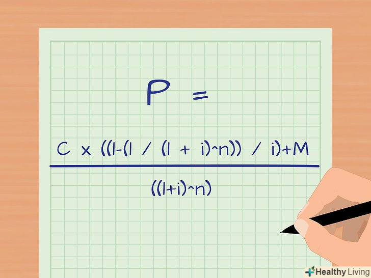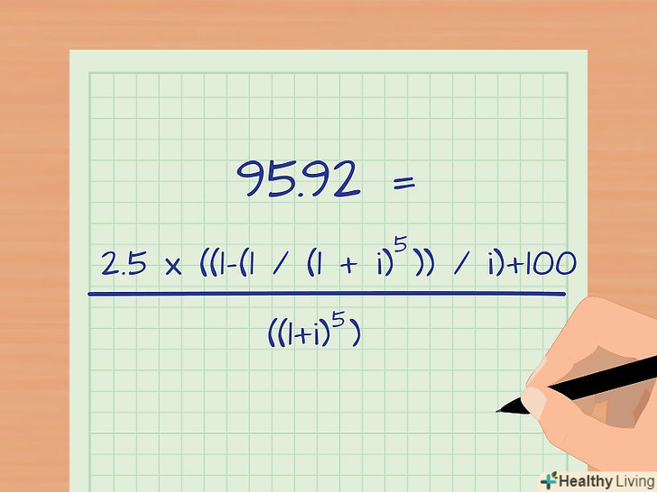 У формулу підставте кілька значень річної процентної ставки, які знаходиться між 6 і 7.для початку підставте 6,9%, а потім зменшуйте значення процентної ставки на одну десяту. Так можна обчислити точну прибутковість до погашення.[7]- Наприклад, в формулу підставте i = 3,45 (6,9/2) і отримаєте Р = 95,70. Це значення близько до реального, але все-таки не дорівнює йому.
