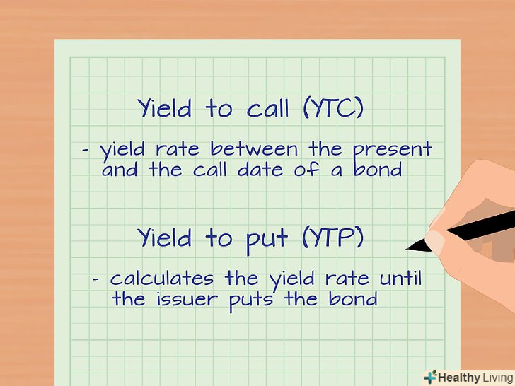 Усвідомте зміни прибутковості до погашення.емітент облігацій може зробити так, що вони не досягнуть терміну погашення. Такі дії знижують прибутковість по облігаціях. Наприклад, емітент може відкликати облігації, тобто погасити облігації до призначеного строку, або викупити їх до строку погашення.[9]