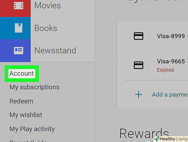 Натисніть наАккаунт.ця опція знаходиться в меню зліва, під опцією "пристрої". Ваш баланс буде відображений вгорі сторінки, в розділі "Спосіб оплати".[2]- Не плутайте баланс "Google Play «з балансом»Google Pay". Баланс Google Play може бути використаний тільки для покупки контенту з Google Play Маркета на зразок додатків, фільмів і музики, тоді як баланс Google Pay може бути використаний для покупки у всіх магазинах, де приймають оплату через Google Pay.