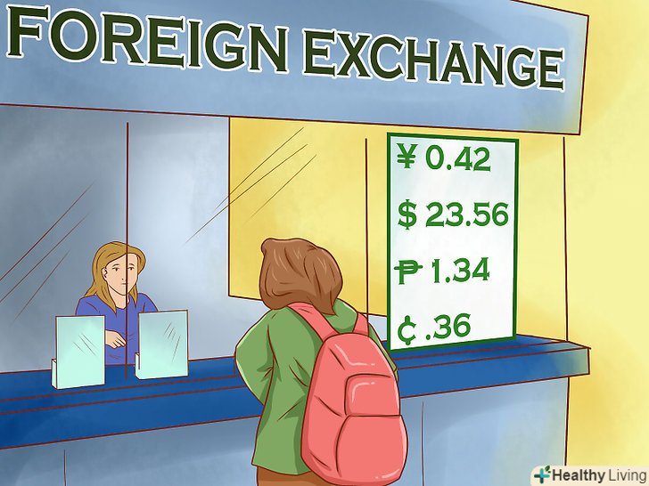 Пам'ятайте про конвертацію валют.якщо ви відправляєтеся в іншу країну, швидше за все, потрібно обміняти валюту. Дізнайтеся заздалегідь, яка валюта використовується в тій країні, куди ви їдете. Дізнайтеся курс цієї валюти і чи можна придбати її у вашій країні. Дізнайтеся котирування. Можливо, курс купівлі цієї валюти у вашій країні буде високий, і Вам буде зручніше купити долари або євро, щоб обміняти їх на місцеву валюту в країні призначення.[17]- Про найбільш вигідний курс валют можна дізнатися на сайтіhttp://www.banki.ru/products/currency / , а конвертувати тут. на сайті Coinmill просто вкажіть, який бюджет вашої подорожі, і ви побачите, скільки це буде у валюті тієї країни, в яку ви прямуєте.
