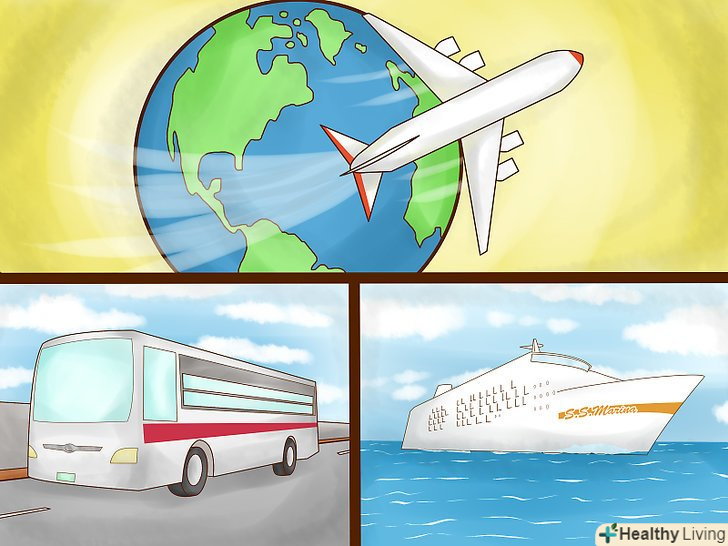 Визначтеся з транспортом.Поїздка в обране Вами місце може коштувати дорого. Визначте, скільки буде коштувати переліт, поїзд, автобус, оренда автомобіля, поїздка на кораблі або інший транспорт, щоб дістатися до обраного вами місця розташування. Літак найчастіше є найшвидшим засобом переміщення, але він може бути дорожче, ніж поїзд, автобус або автомобіль. Круїзи на кораблі теж є дорогим задоволенням. Часто круїзний корабель зупиняється в декількох портах на шляху прямування.[3]- Порівнювати ціни на авіаквитки можна на сайтах Google Авіаквитки, SkyScanner.ru, AviaSales.ru, FareCompare.com (англійською), або Kayak.ru. Обов'язково порівнюйте ціни і варіанти перш, ніж купувати квитки.