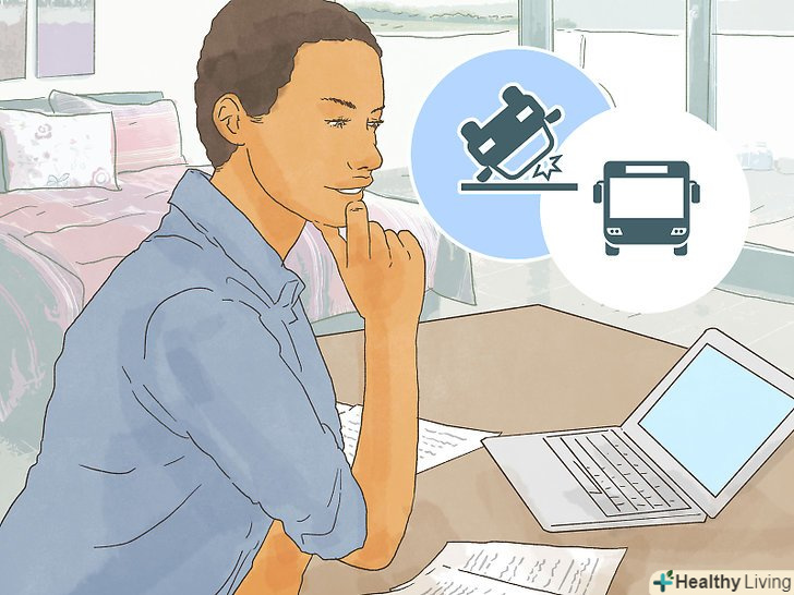 Складіть запасний план.при відсутності фінансового захисту вам потрібно діяти обережно в багатьох життєвих питаннях. Ви будете почувати себе спокійніше, якщо створите хоча б по одному запасному плану для всіх основних рішень і дій, які будете робити. Подумайте як про найгірші, так і про кращі варіанти результату подій.[16]- Якщо ви, наприклад, економите гроші, добираючись на роботу на велосипеді, що ви будете робити, якщо він зламається? Дізнайтеся заздалегідь, як можна дістатися до пункту призначення на громадському транспорті, щоб у вас був запасний план.
