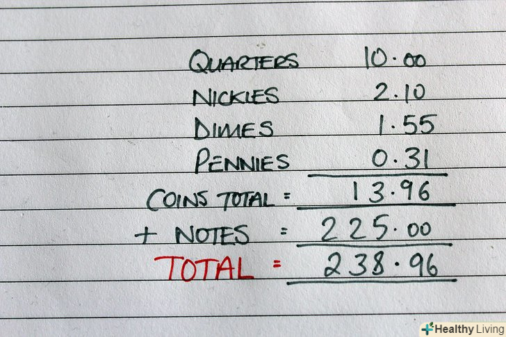 Підрахуйте монети.аналогічно тому, як ви вважали купюри, підрахуйте монети. Припустимо, у вас 3 десятки, 10 п'ятірок, дві монети по рублю і 1 - по 10 копійок. Записуємо: 30+50+2+0,10, складаємо і отримуємо 82,1!