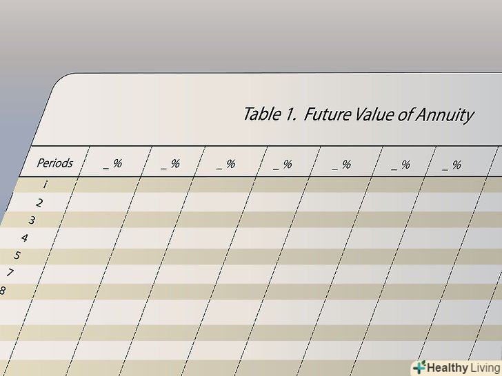 Внесіть зміни в розрахунок у разі, якщо ваша рента не почне виплачуватися протягом декількох років.- Знайдіть майбутню вартість свого початкового залишку коштів за допомогою таблиці Фактора майбутньої вартості (посилання на неї наведена в джерелах), який залежить від відсотка, який накопичиться до вашої ренти з теперішнього моменту до моменту, коли вона почне виплачуватися, і числа років, поки ви не отримуєте платежі.