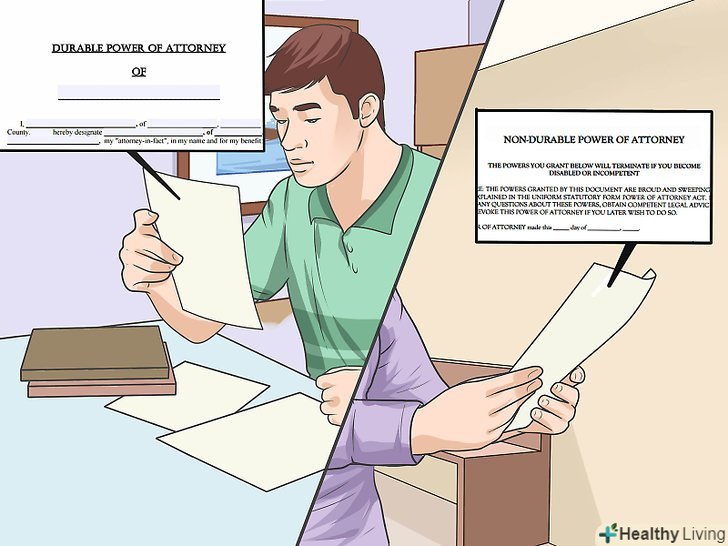 З'ясуйте, який вид довіреності вам потрібен.довіреності можуть відноситися як до фінансових питань, так і до охорони здоров'я (або обидва). Також існує два види довіреностей: тривалі і короткострокові. [4]- Фінансова довіреність дає представнику право здійснювати фінансові операції від імені представляється.