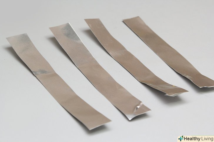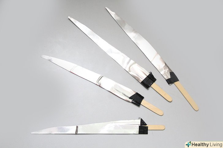 Виріжте 4 леза довжиною 17,5 см зі складеної фольги.розділіть кожну пару. Потім виріжте невеликий отвір (2,5 см) на краю леза в кожній парі. Вам потрібно це зробити, інакше ви не зможете приєднати леза до пальців рукавички.