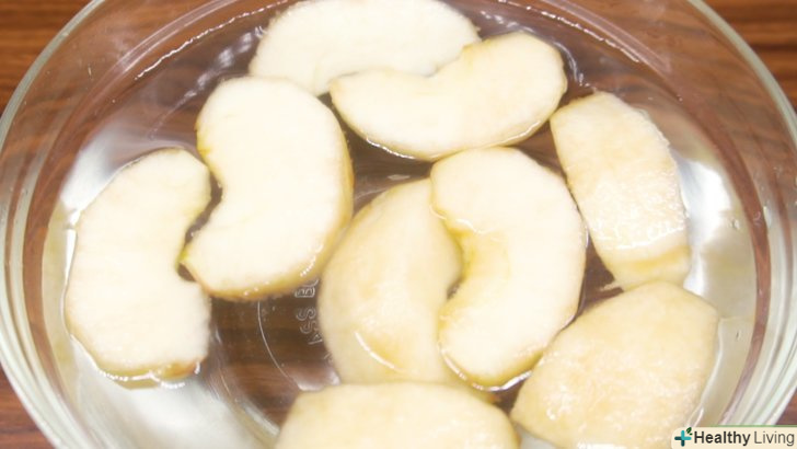 - Щоб яблука зберегли свіжість, вимочіть їх в солоній воді.налийте в миску 4 склянки (1 літр) злегка теплої води і додайте 1 столову ложку або близько 20 грамів солі (підійде звичайна кухонна сіль). Перемішайте воду, щоб розчинилася вся сіль, і покладіть в неї скибочки яблук. Вимочуйте яблука кілька хвилин, потім дістаньте їх з солоної води.[5]