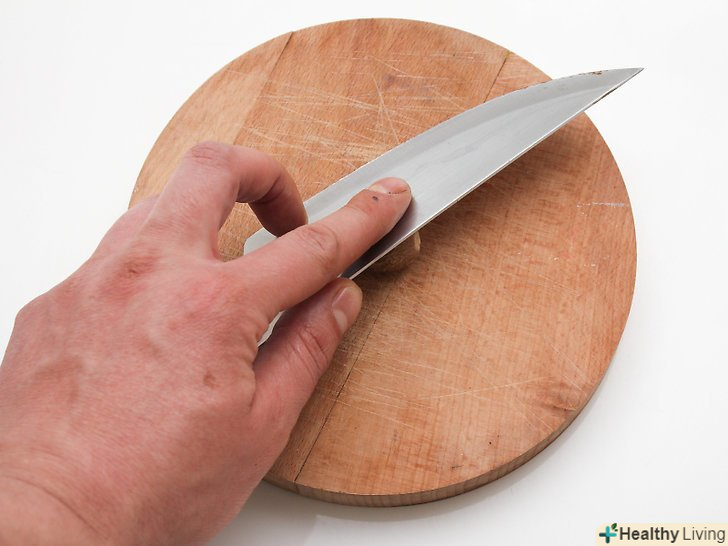 Роздушіть шкаралупу мускатного горіха, притиснувши горіх тарілкою або ножем поверненим боком, поки він знаходиться на обробній дошці.направте лезо ножа від себе.