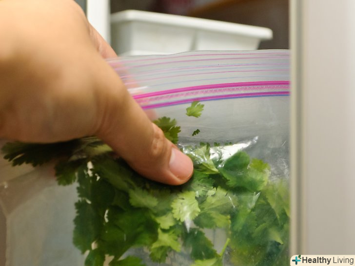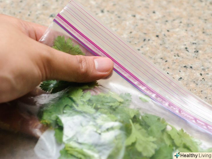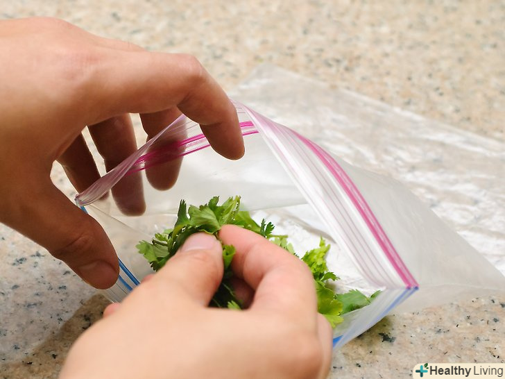 Покладіть кінзу в спеціальний пакет для заморожування з замком.постарайтеся розкласти кінзу рівномірно по всьому пакету. Якщо ви використовуєте цілі пучки кінзи, то постарайтеся зробити так, щоб стебла і листя лежали максимально рівно. Ви можете використовувати кілька пакетів.- Якщо у вас немає спеціальних пакетів для заморозки, то ви можете використовувати звичайні пакети з замком, просто покладіть їх один в одного.