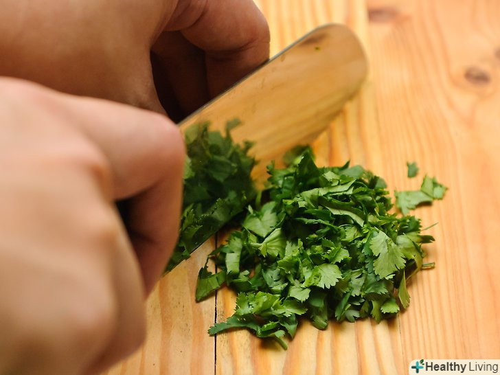 Наріжте кінзу.покладіть гілочки кінзи на обробну дошку і наріжте шматками по 2-3 см.стебла можете залишити або прибрати, в залежності від ваших уподобань. Не обов'язково нарізати кінзу акуратно, оскільки потім її все одно буде необхідно подрібнити в блендері.