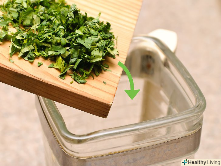 Налийте в блендер оливкову олію в розрахунку 1/3 склянки (80 мл) масла на склянку (50 г) нарізаної кінзи.[6] якщо ви хочете посилити смак кінзи, то збільште кількість зелені до 2 склянок (100 г).[7] крім цього, якщо вам не подобається специфічний запах оливкової олії, то використовуйте будь-яке інше масло, наприклад, кукурудзяна або соняшникова.