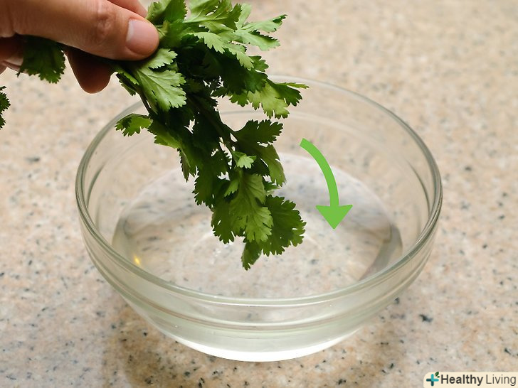 Помийте кінзу в мисці з водою.Тримайте кінзу за стебла і опустіть її в миску з холодною водою. Прополощіть кінзу, щоб вона стала чистою. Їли вода стане брудною, то поміняйте її і знову промийте кінзу-міняйте воду до тих пір, поки кінза не стане абсолютно чистою. Для цього може знадобитися змінити воду два-три рази.