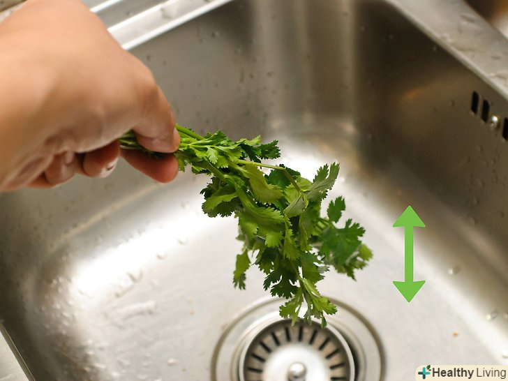 Струсіть з кінзи воду.тримаючи зелень за стебла, струсіть зайву воду кілька разів. Найкраще робити це над раковиною, щоб не забризкати кухню.