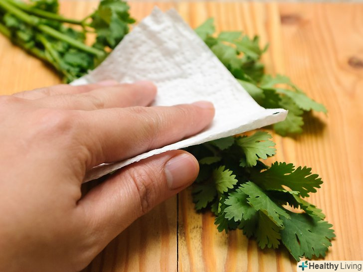 Промакніте кінзу сухими паперовими рушниками.покладіть кілька сухих паперових рушників на рівну поверхню і покладіть зверху помиту кінзу. Накрийте зелень іншим паперовим рушником і злегка натисніть. Паперові рушники вберуть зайву вологу. Промакніте кінзу ще кілька разів так, щоб на ній не залишалося води.[2]