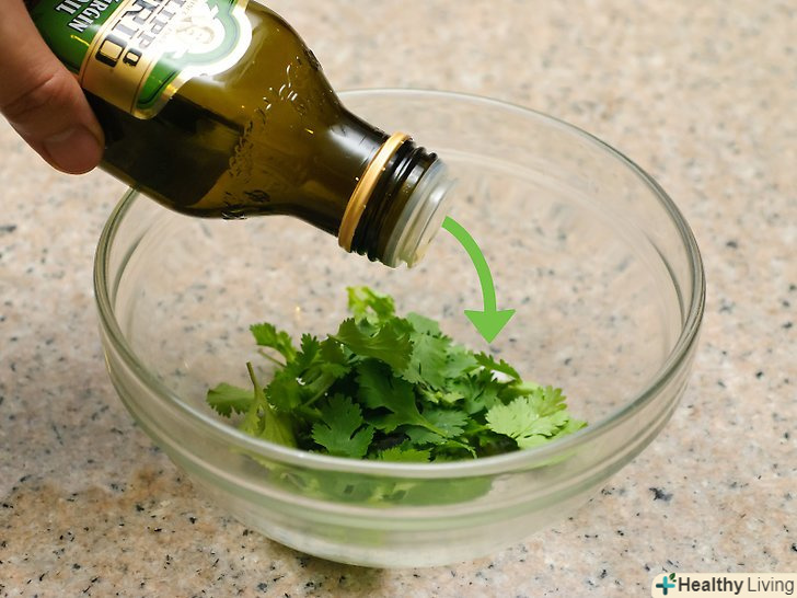 При бажанні змішайте кінзу з оливковою олією.це дозволить захистити ніжну зелень від холоду і не дасть їй перетворитися в кашу.[4] Просто покладіть траву в миску і перемішайте її з чайною ложкою оливкової олії. Кількість масла залежить від кількості кінзи, яку ви хочете заморозити.