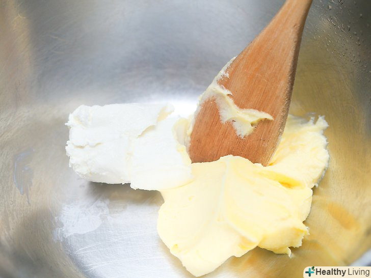 У невеликій мисці змішайте 90 грам вершкового сиру і 90 грам розм'якшеного вершкового масла.можете скористатися електричним міксером.